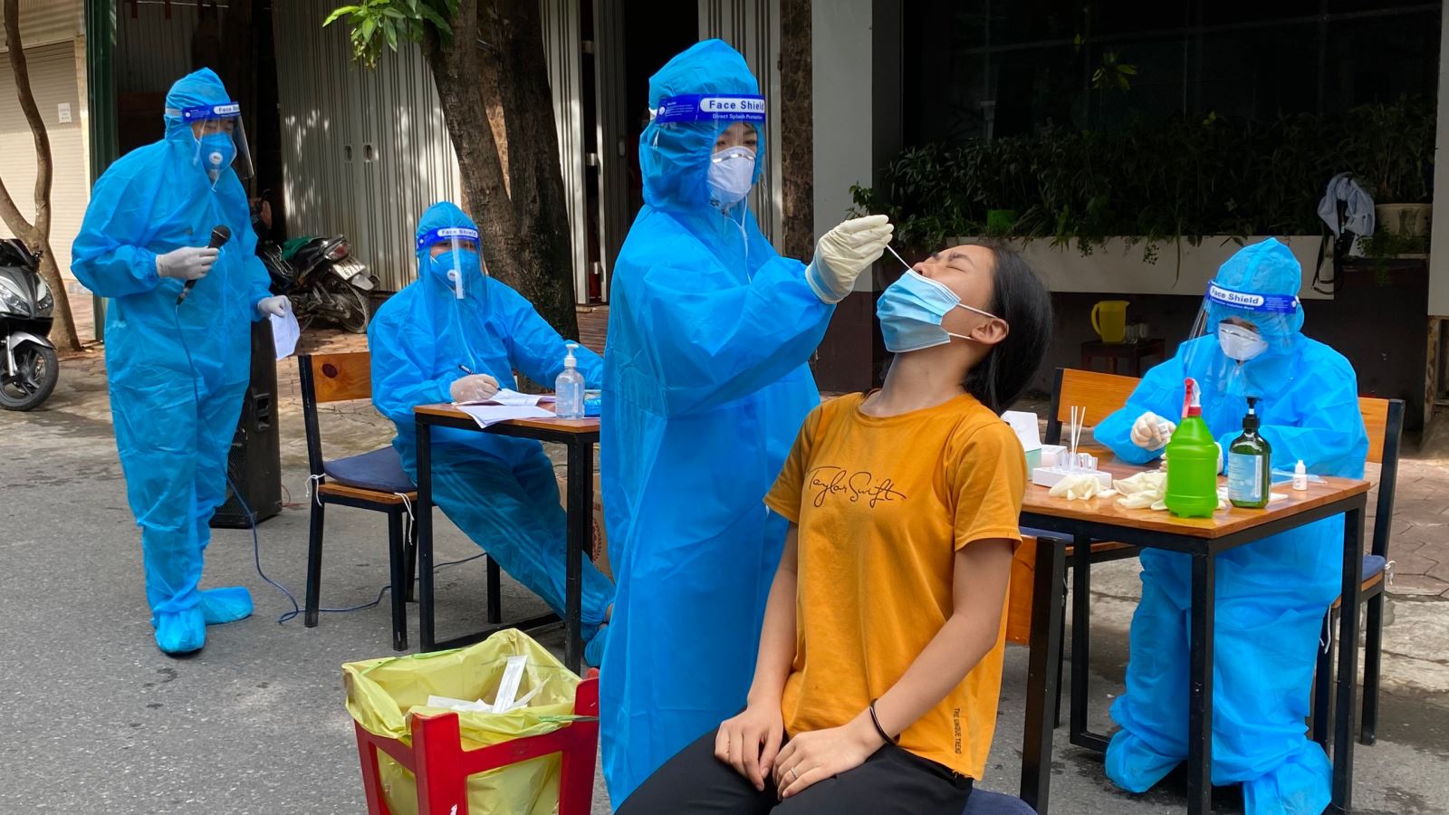 Cán bộ Bệnh viện CT-CH Nghệ An thực hiện lấy mẫu xét nghiệm COVID-19 cho người dân trong khu vực phong tỏa
