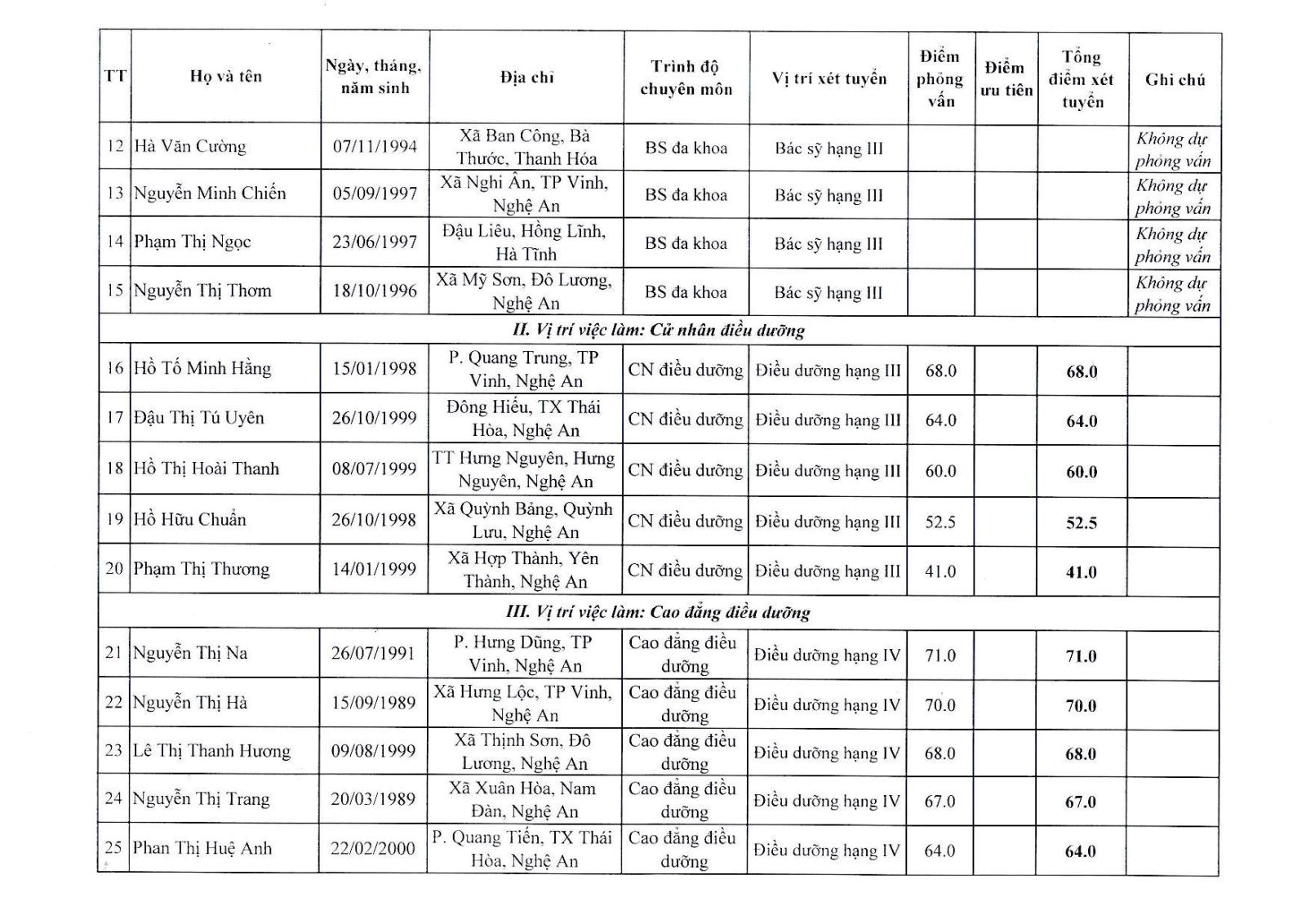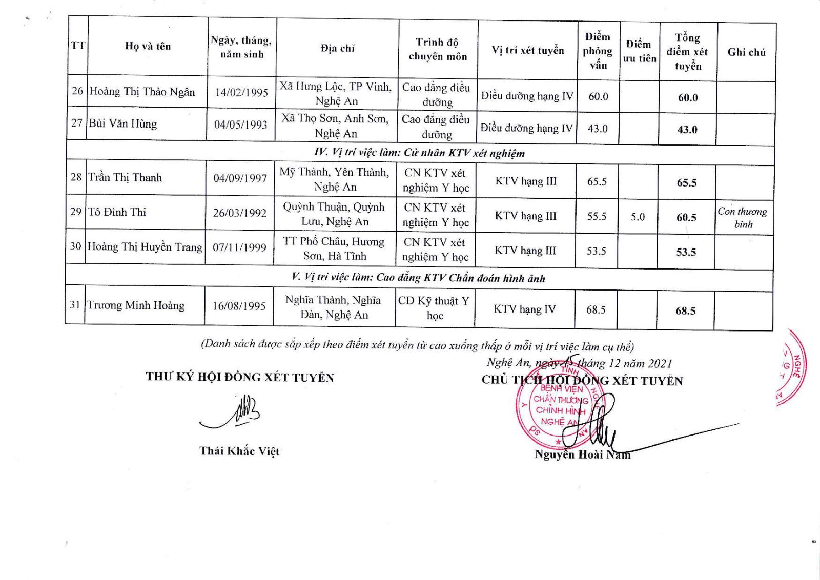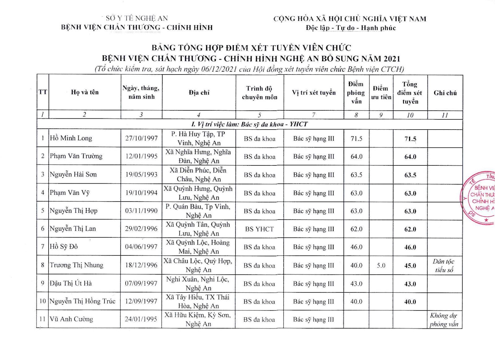 Bệnh viện Chấn thương Chỉnh hình Nghệ An thông báo bảng tổng hợp điểm xét tuyển viên chức bổ sung năm 2021 như sau: